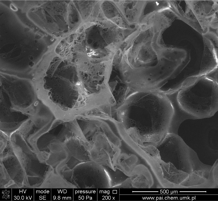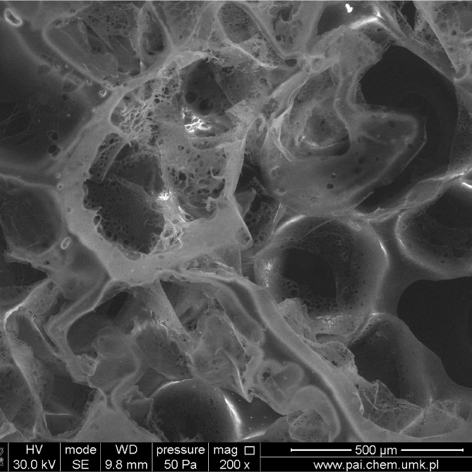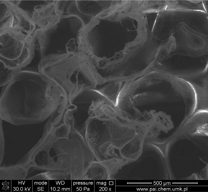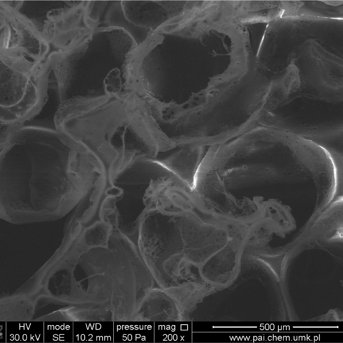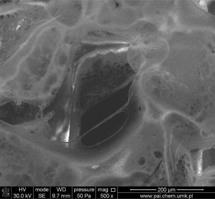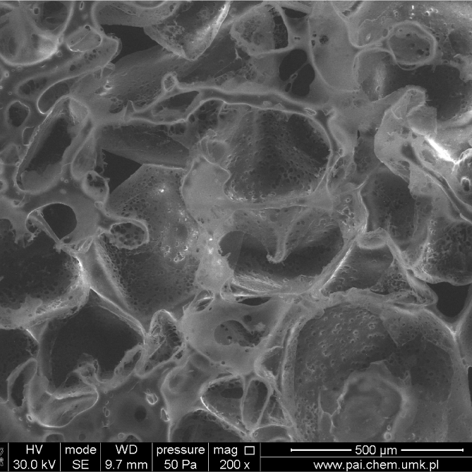 Zdjęcia opatrunku Dibucell Active wykonane na skaningowym mikroskopie elektronowym (SEM) model Quanta 3D FEG Fei Europe Przedstawiają przestrzenną strukturę opatrunku, pełniącą rusztowanie dla komórek biorących udział w ziarninowaniu i naskórkowaniu.